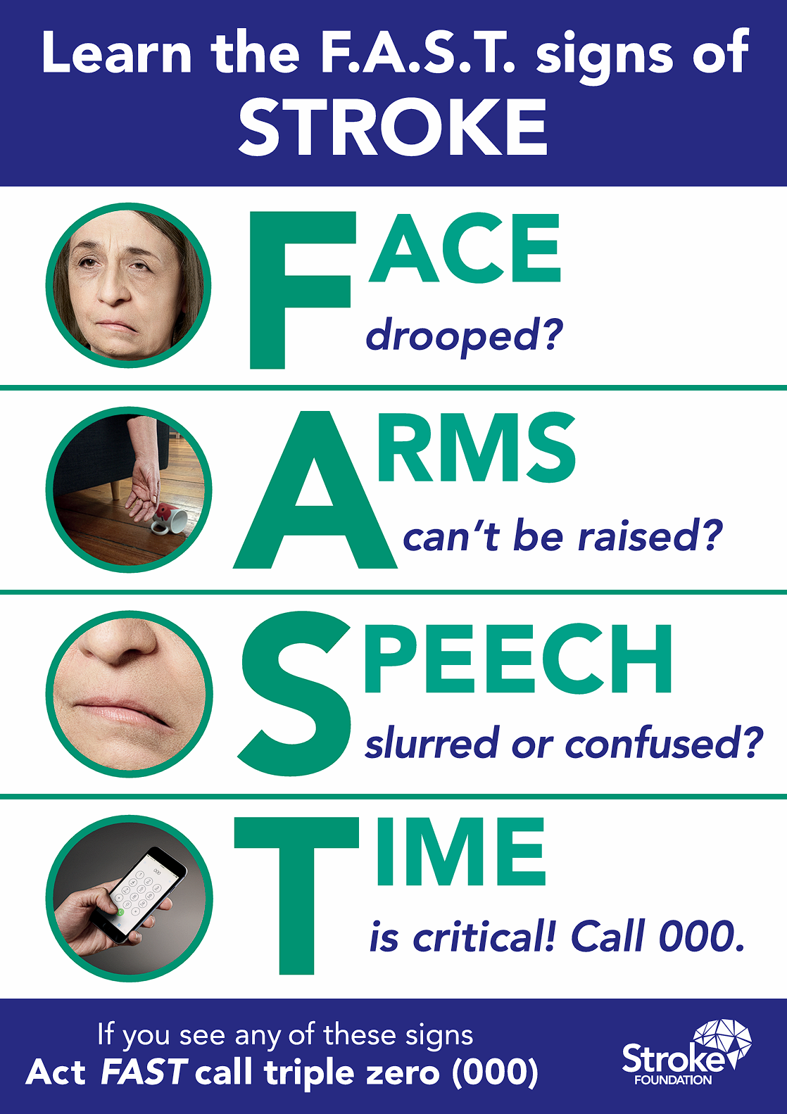 The Stroke Foundation uses the F.A.S.T. test to help people recognise the most common signs of stroke: